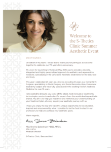 As the founder and Medical Director of the multi-award winning S-Thetics Clinic in Beaconsfield, Buckinghamshire, she specialises in regenerative aesthetic treatments for the skin, face and body.