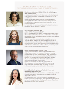 ‘Platelet Rich Plasma’ is one of the key emerging treatments and trends in our exciting field of regenerative medicine. Having recently introduced our ‘Golden Glow’ facial treatment, combining PRP with Hyaluronic Acid, this is a unique opportunity to hear more from a renowned specialist in her field.