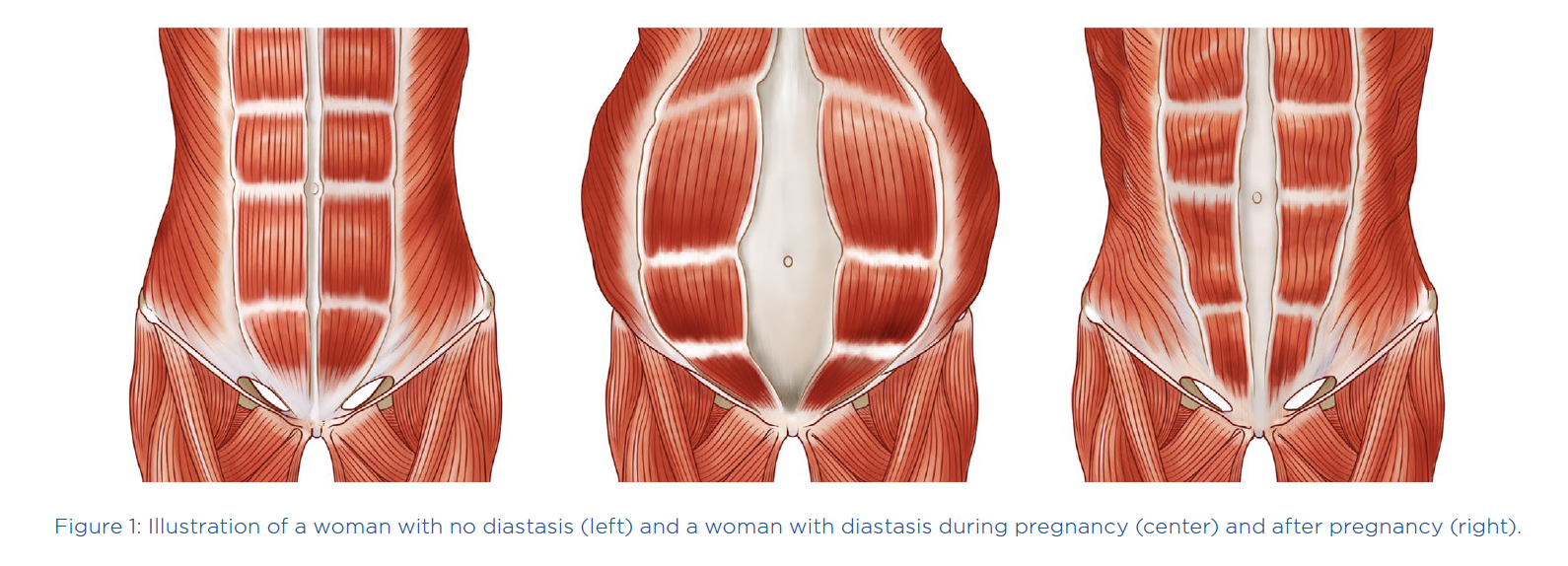Diastasis Recti is a separation of the rectus abdominis (often referred to as the six-pack muscle).