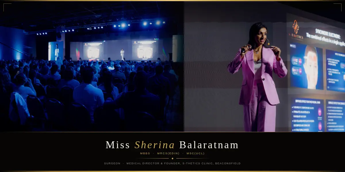 Miss Sherina Balaratnam MBBS MRCS(Edin) MSc(UCL) is the Founder and Medical Director of S-Thetics Clinic in Beaconsfield, Buckinghamshire. With over 26 years as a qualified doctor, a 7-year background in NHS reconstructive plastic surgery, and 14 years specialising in aesthetic medicine, she holds a rare combination of surgical training and aesthetic expertise. She is a Tatler Top Doctor 2026, peer-voted UK Medical Aesthetic Practitioner of the Year, co-author of the Oxford Textbook of Aesthetic Medicine, and the first non-US Doctor appointed as a BTL Aesthetics Global Key Opinion Leader in over 30 years.